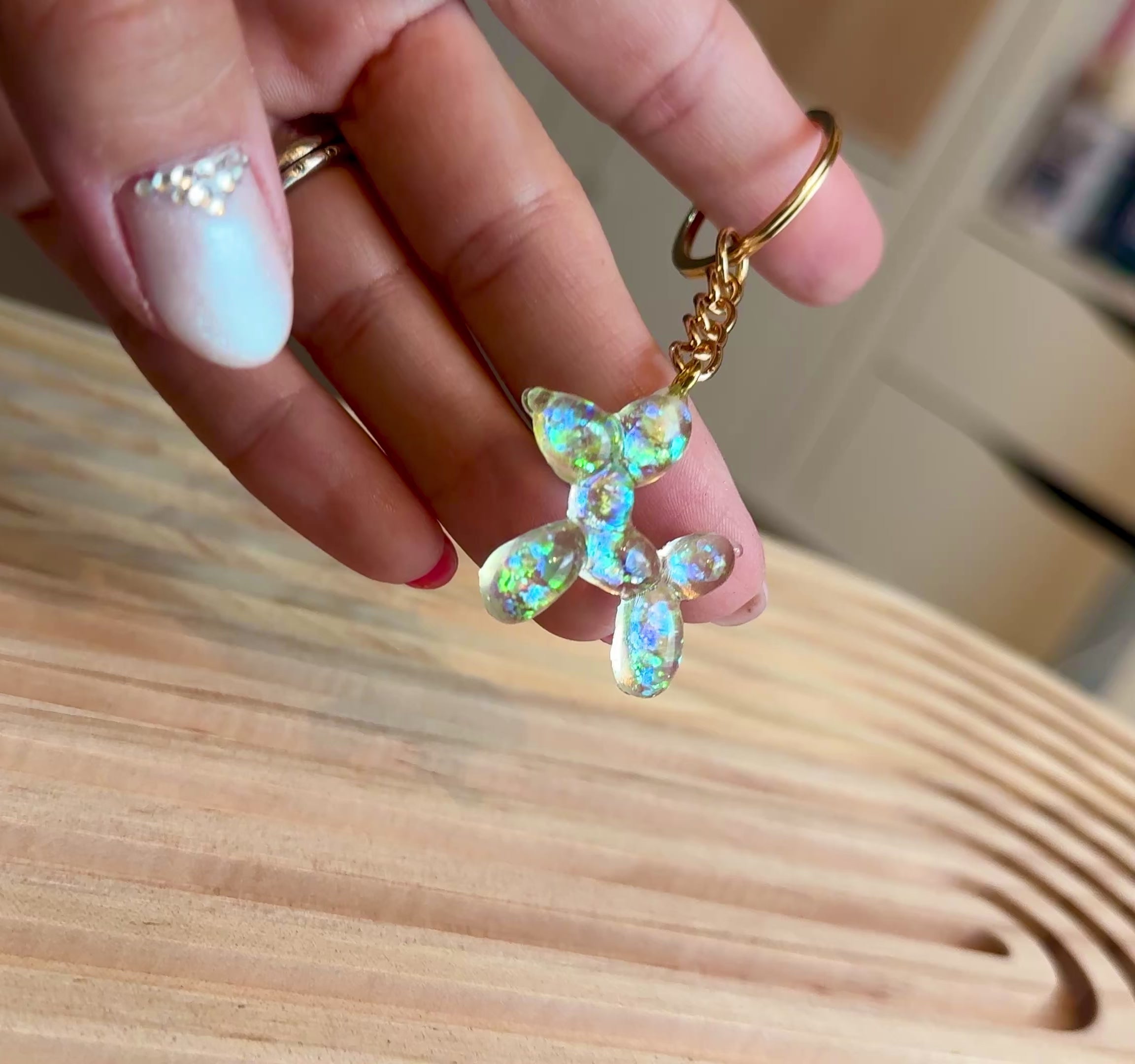 Un portachiavi ispirato ai classici palloncini a forma di cane, rivisitato in versione scintillante e trendy.