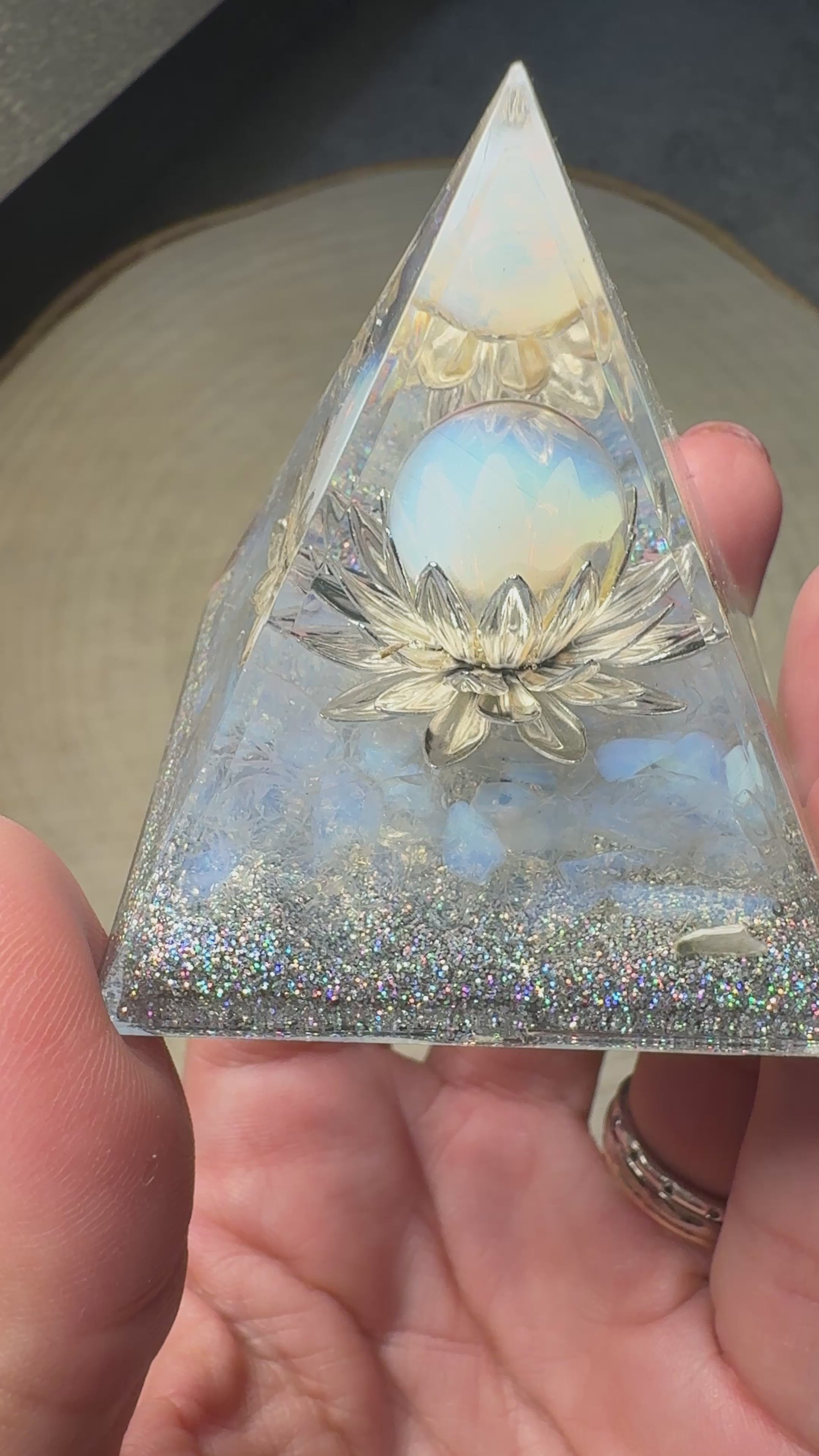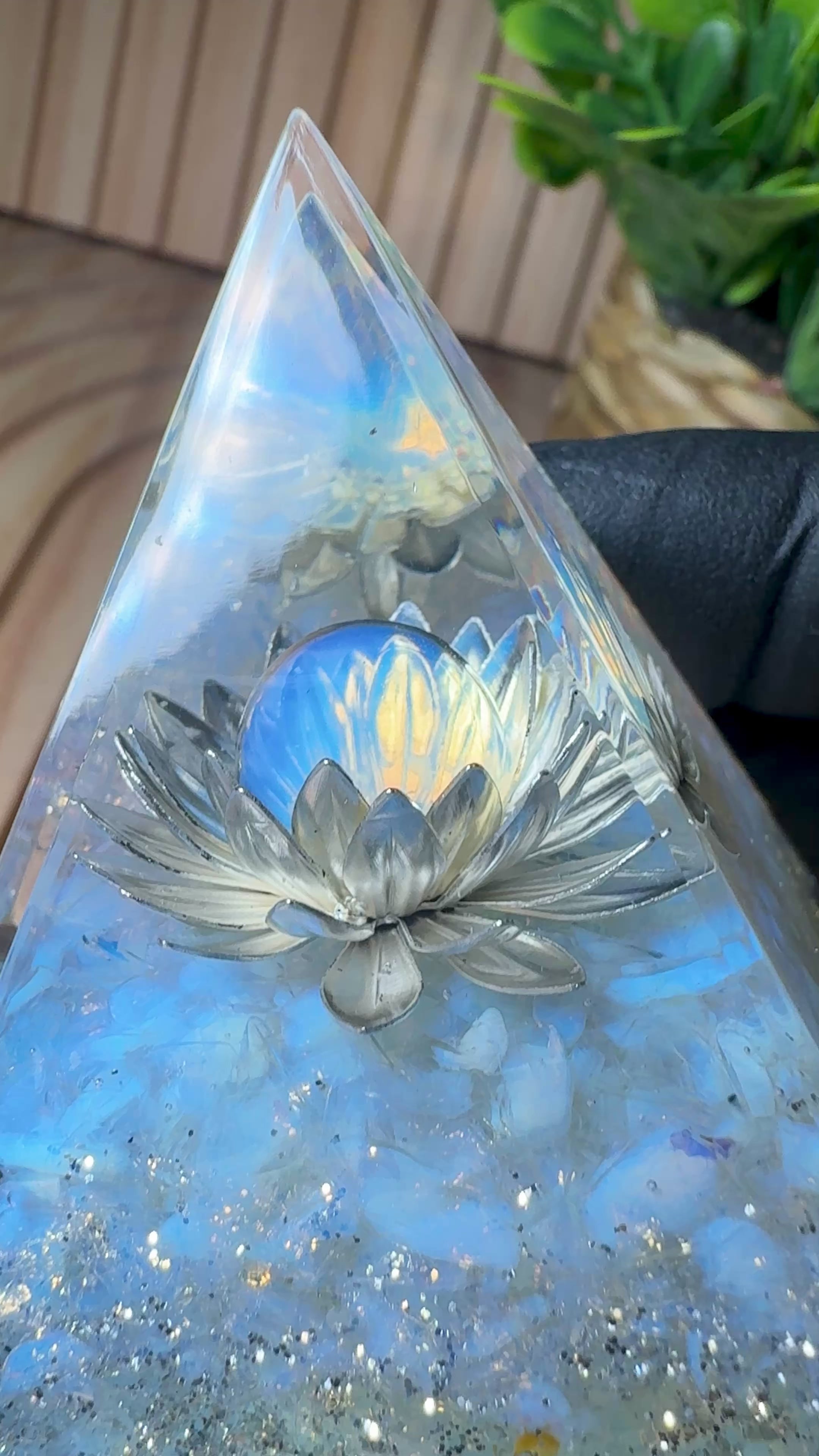 Questa piramide custodisce una sfera opalescente avvolta da un fiore di loto argentato, simbolo di rinascita spirituale. Alla base, riflessi arcobaleno e frammenti di luce vibrano tra cristalli chiari, creando un effetto etereo e profondo.