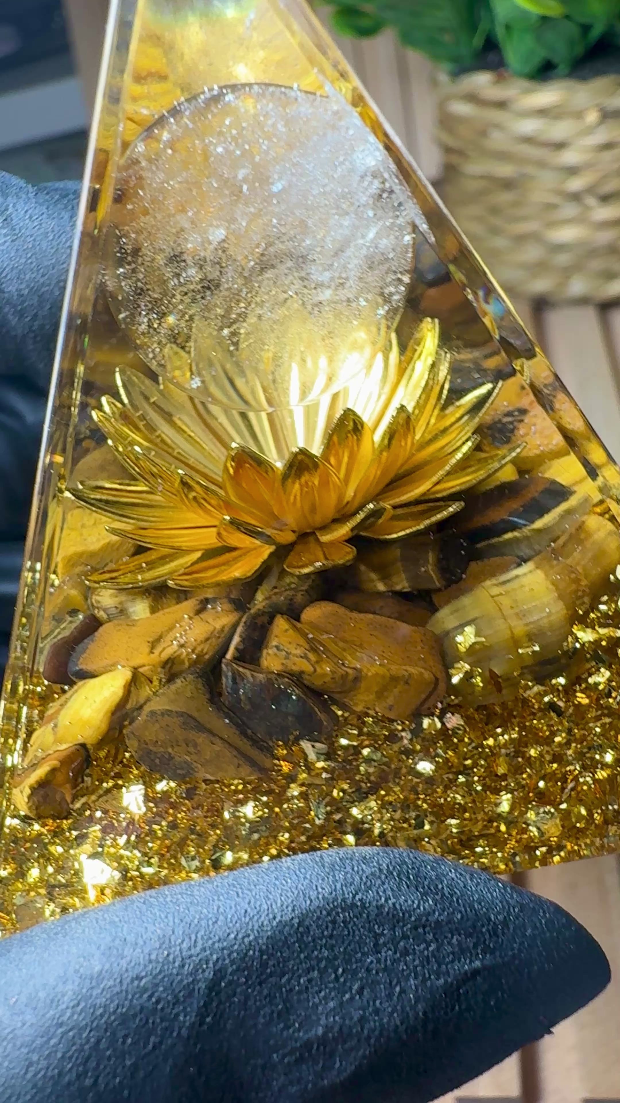 Questa piramide unisce la forza protettiva dell’Occhio di Tigre alla luminosità del fiore dorato, creando un potente simbolo di fiducia, equilibrio e energia vitale.