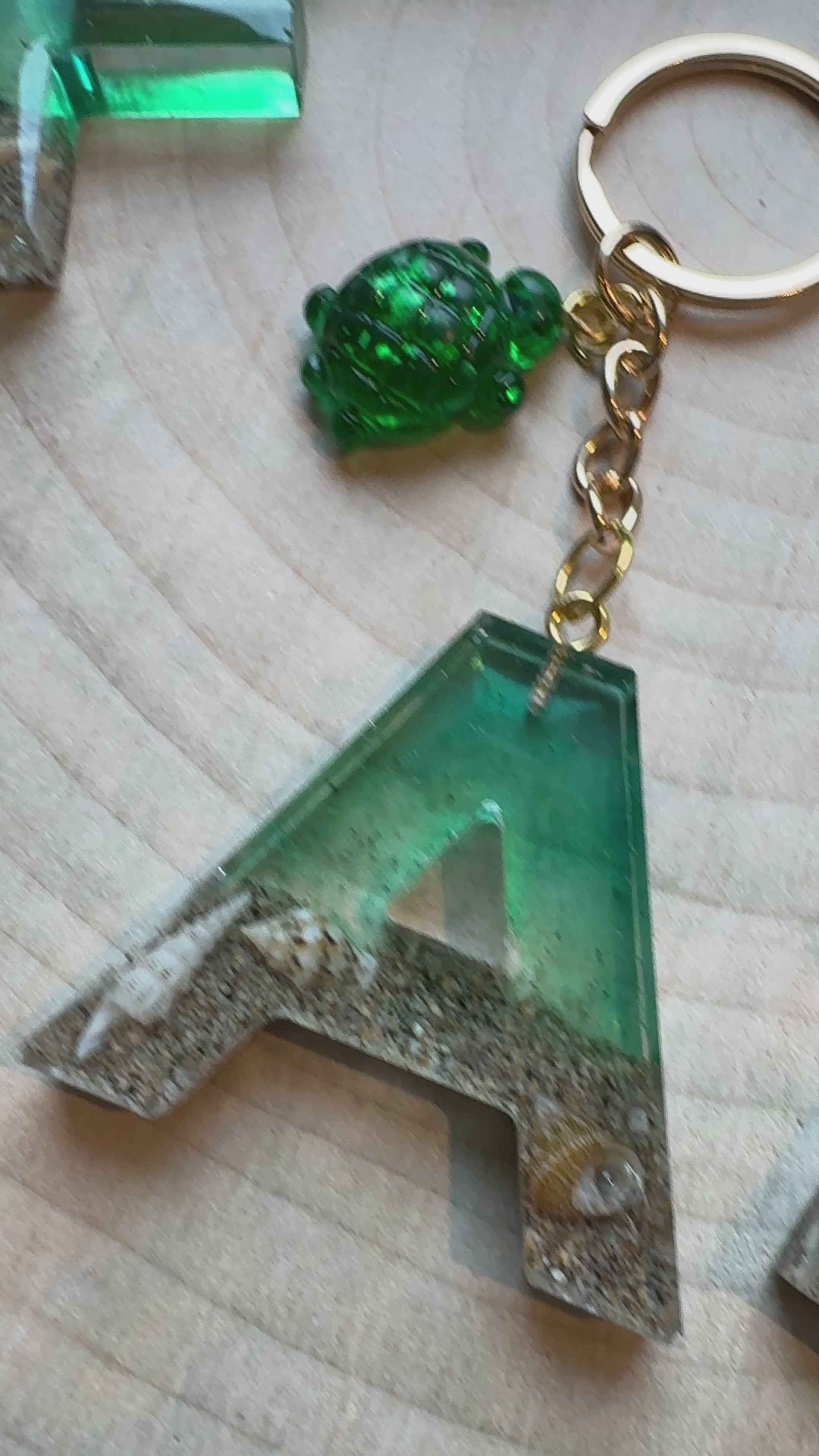 Questi splendidi portachiavi con lettera personalizzata sono realizzati a mano in resina trasparente, con sabbia, conchiglie vere e un effetto sfumato che ricorda le onde dell’oceano.